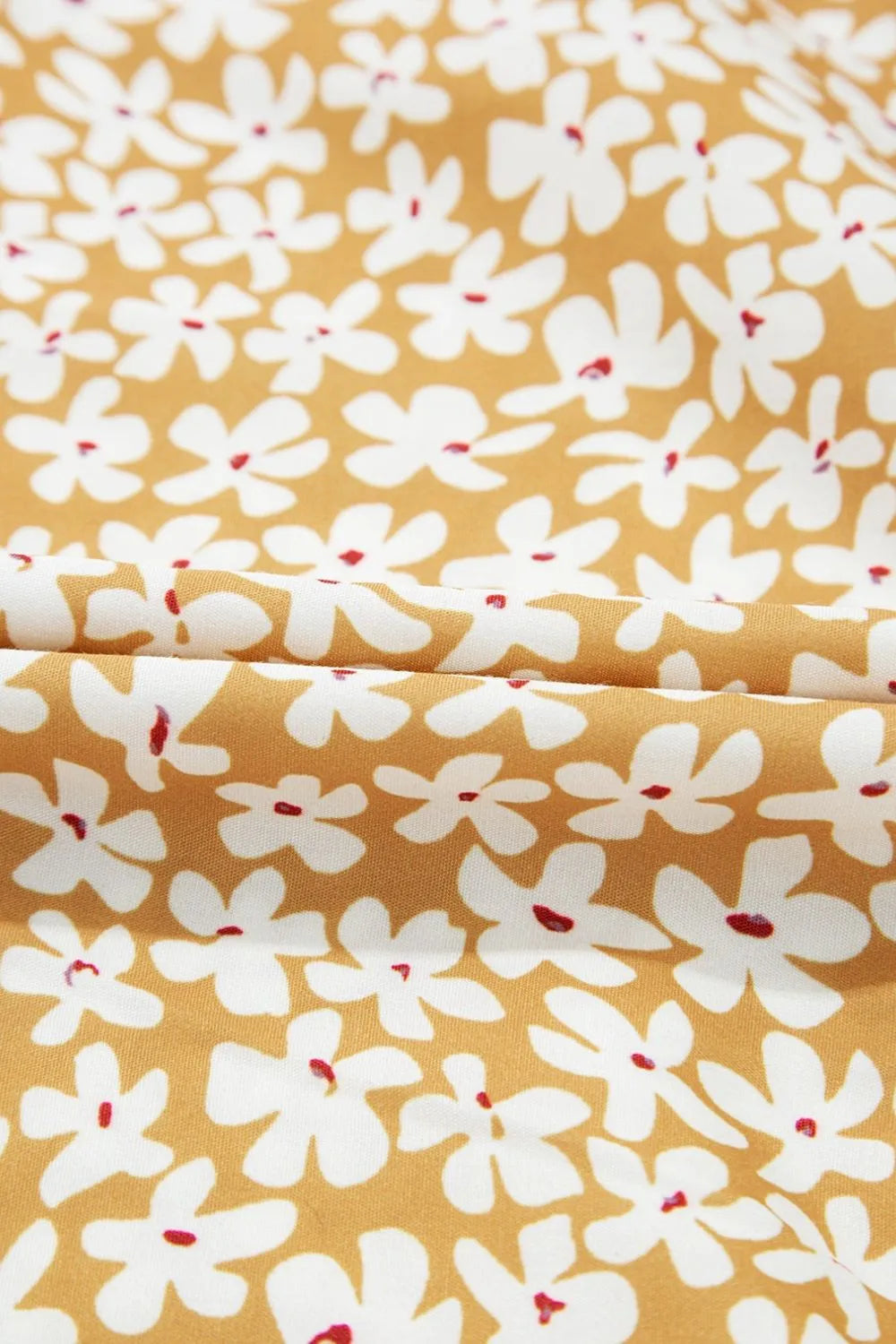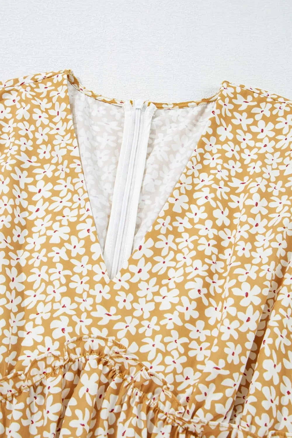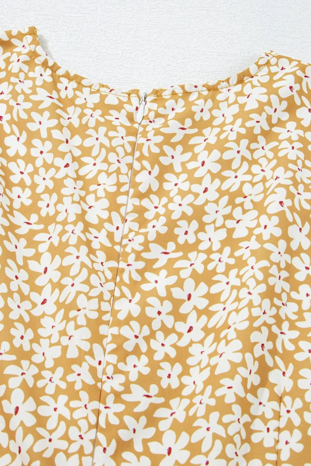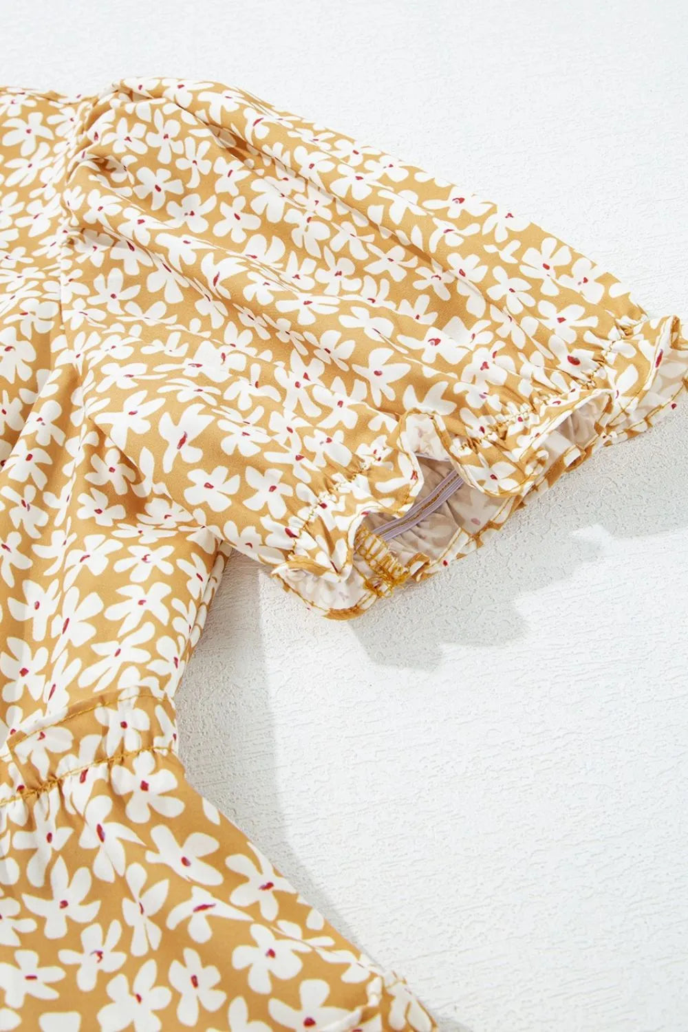 Vestido corto amarillo con vuelo y mangas cortas florales