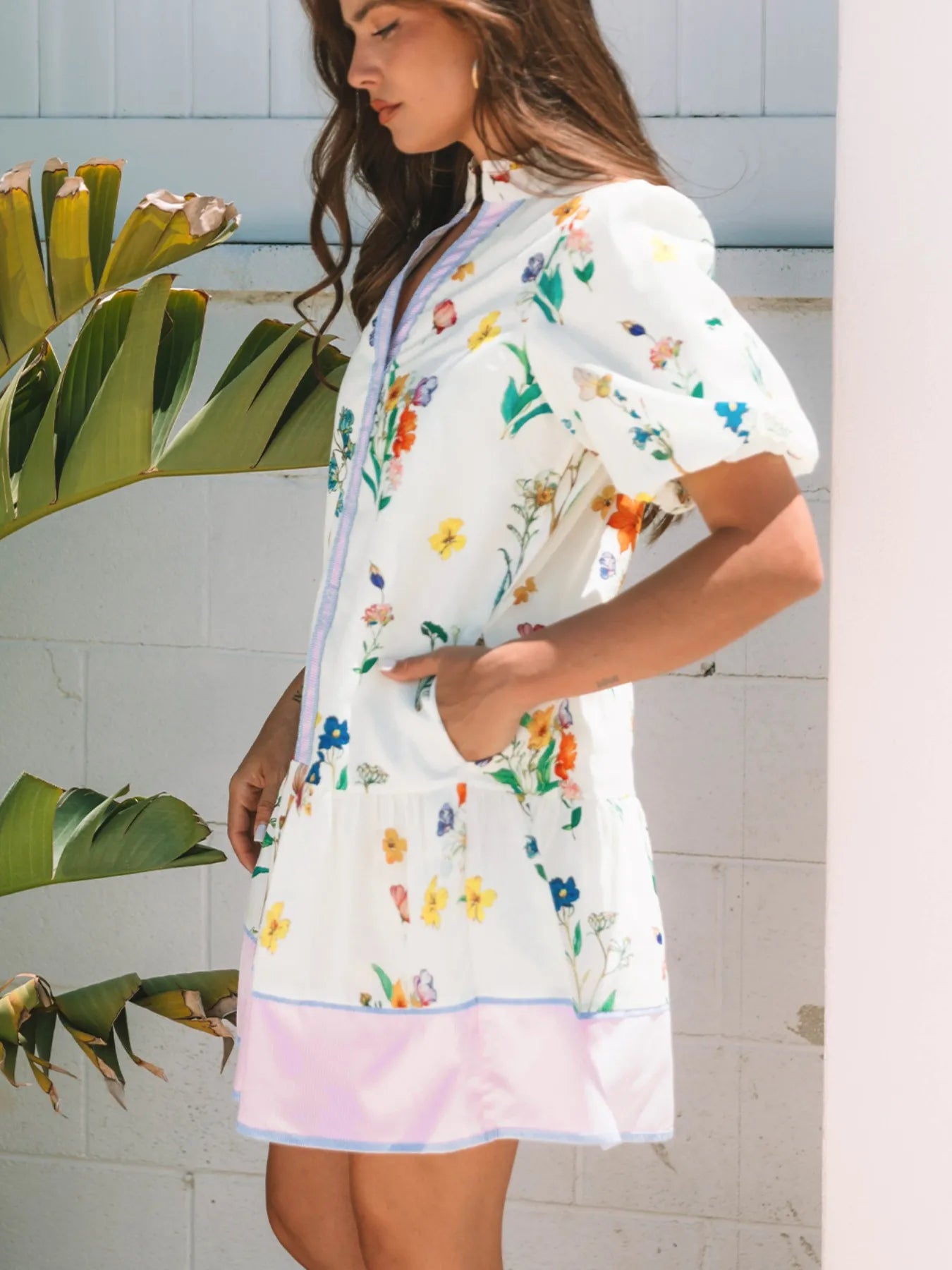 Vestido corto blanco con estampado floral y mangas cortas