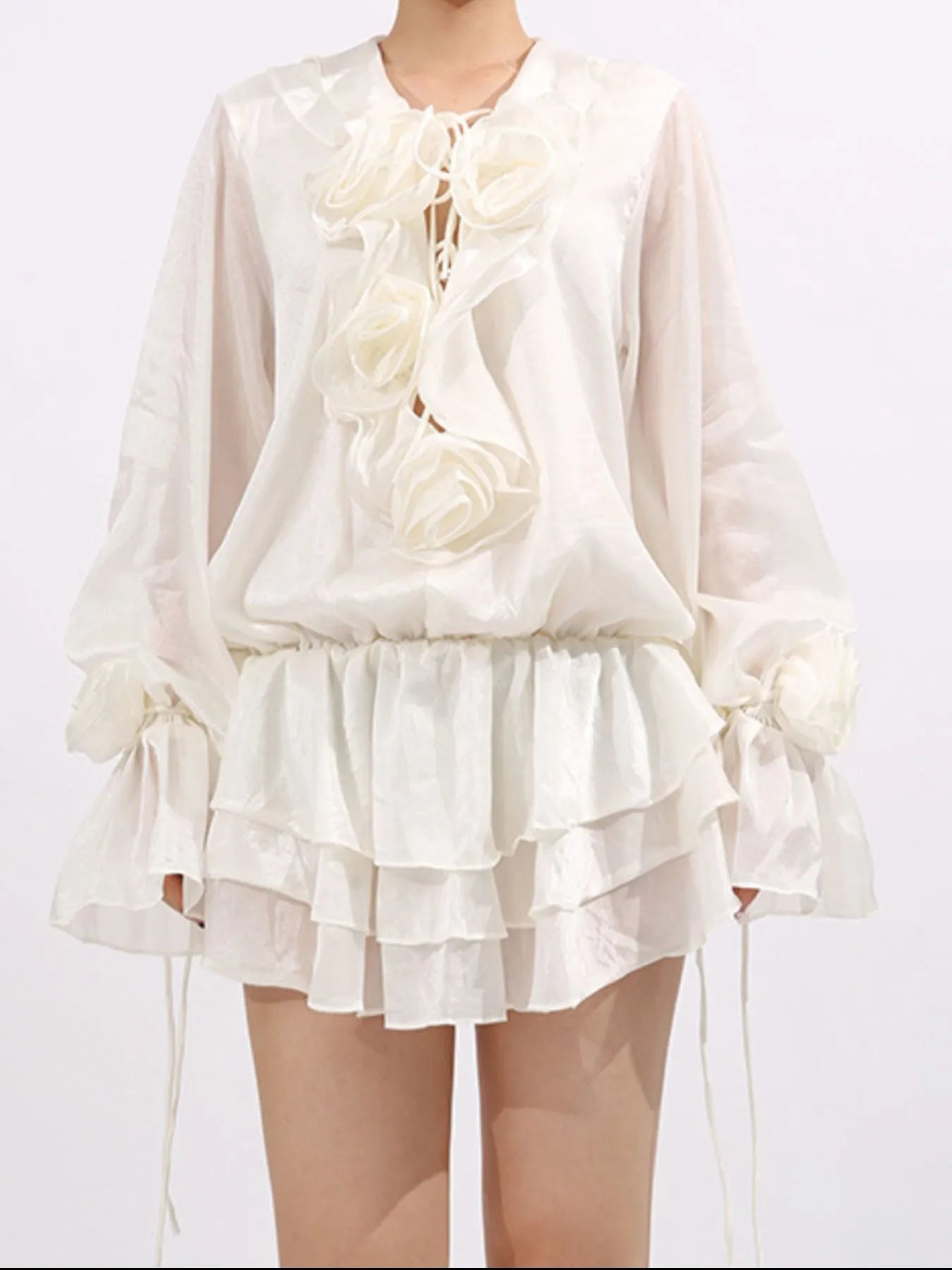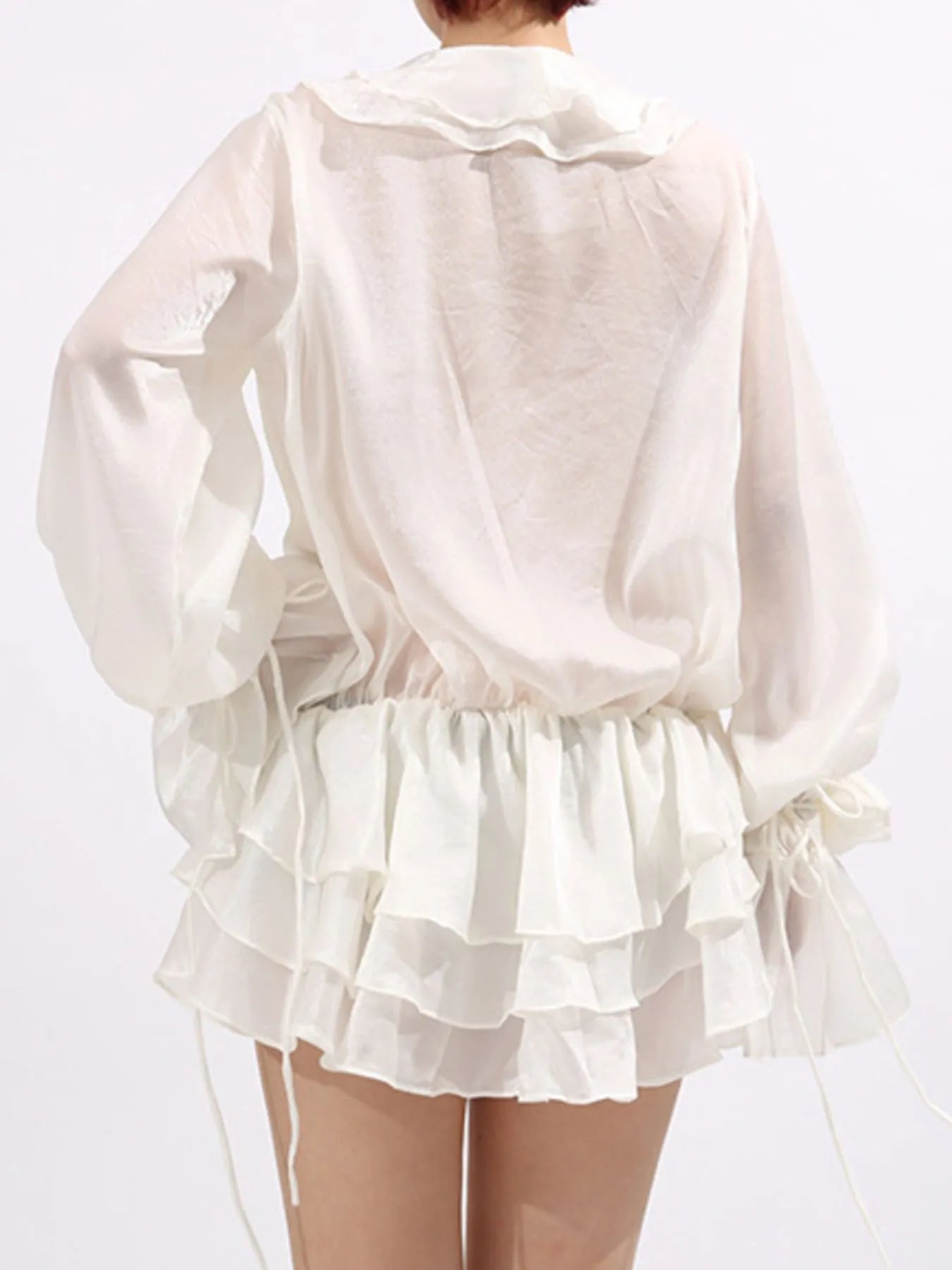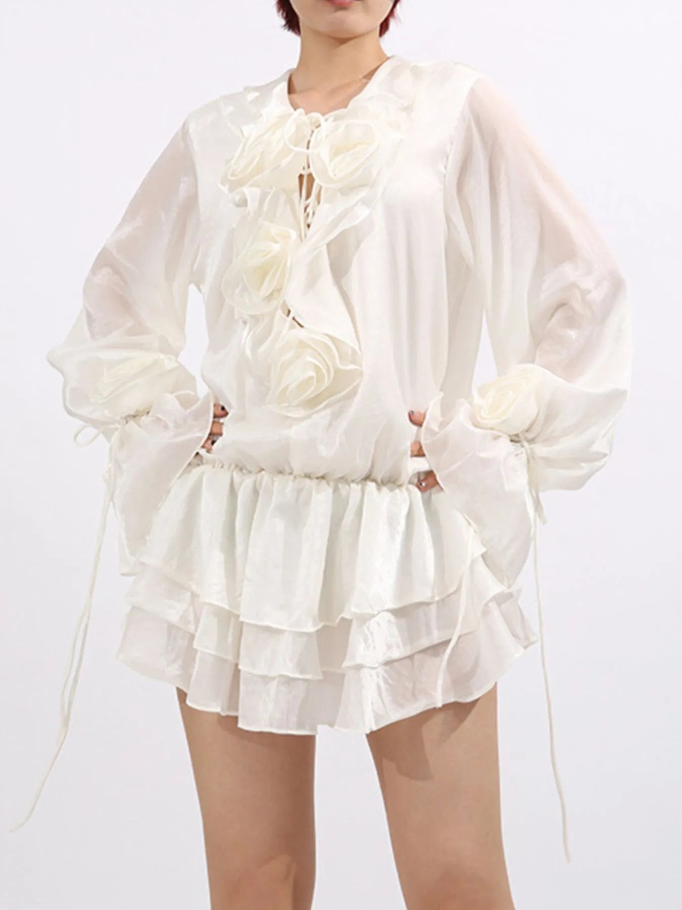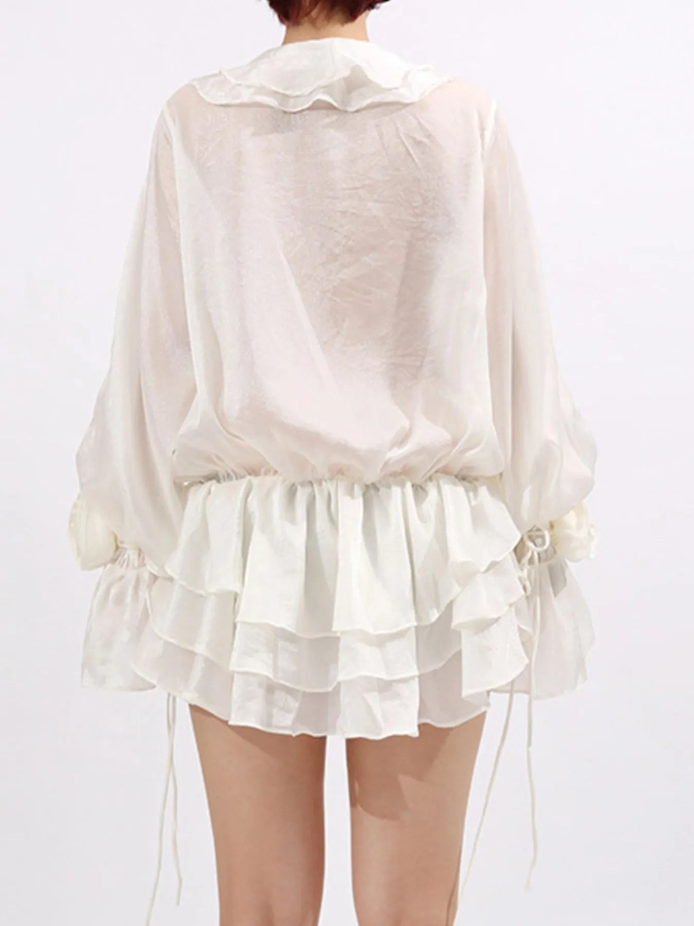 Vestido Corto Blanco con Volantes y Mangas Largas