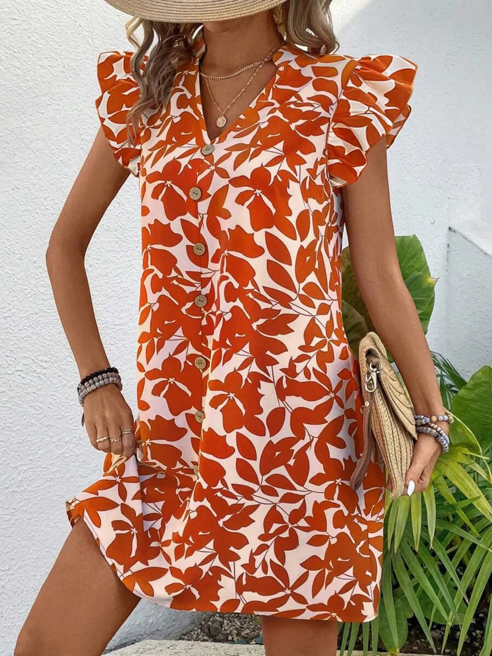 Vestido corto naranja con botones decorativos elegante