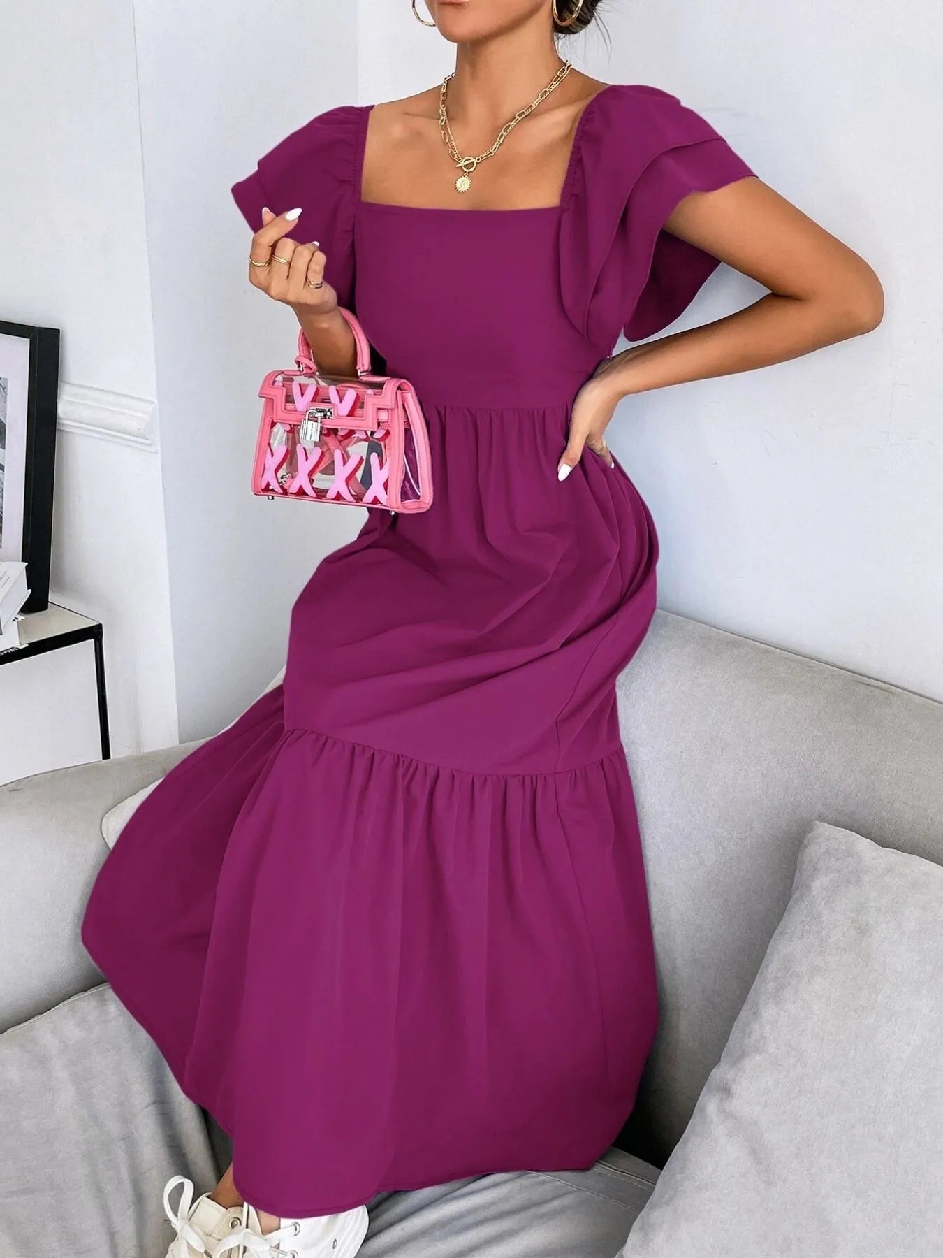 Vestido Largo Azul Cuello Cuadrado con Volantes