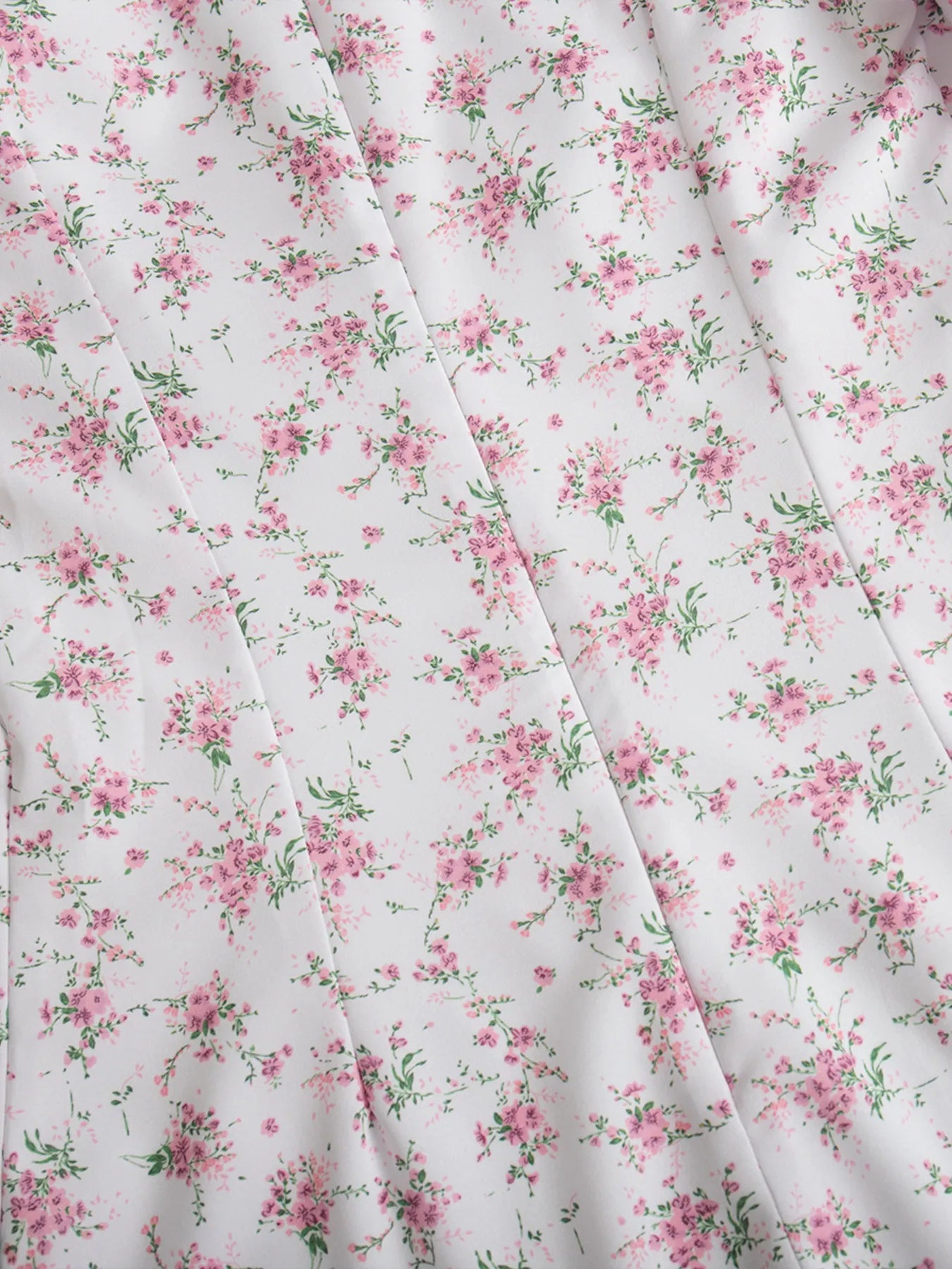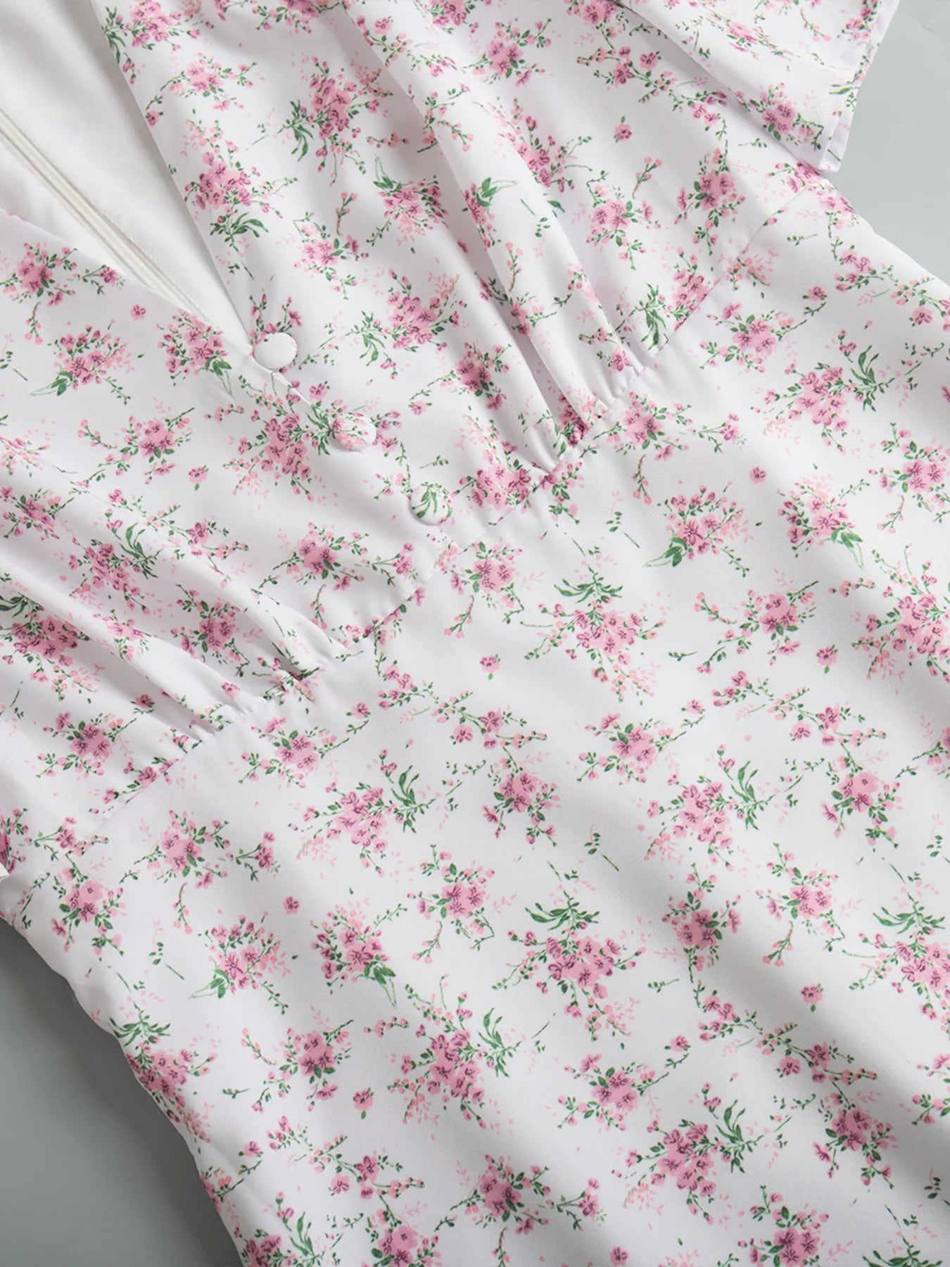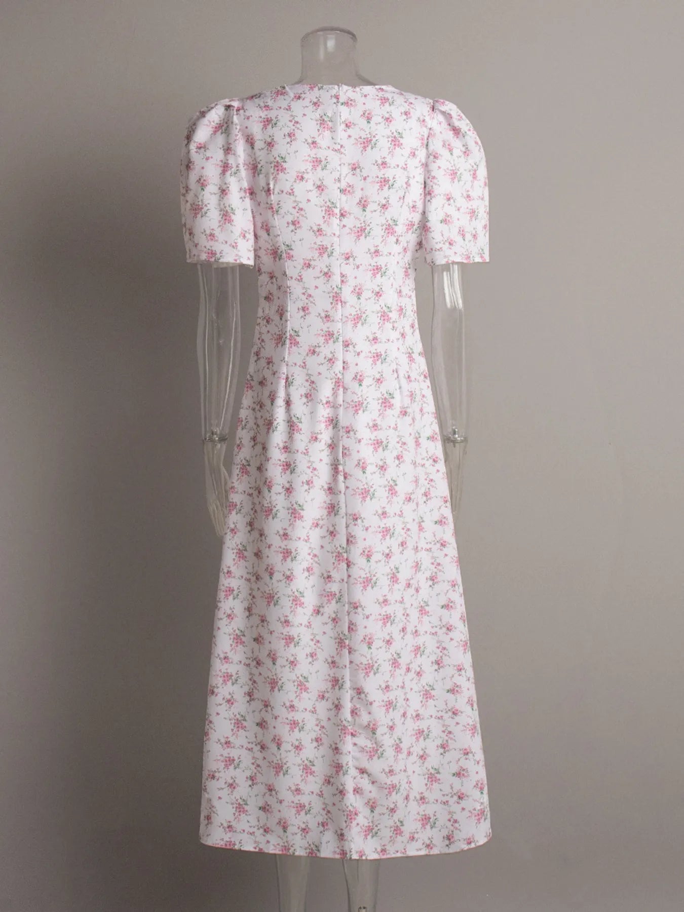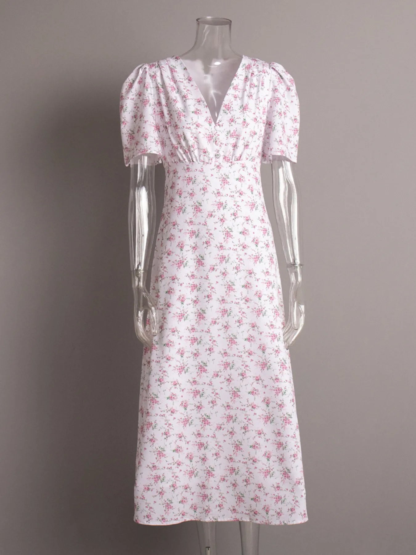 Vestido Largo Blanco con Estampado Floral y Mangas Cortas
