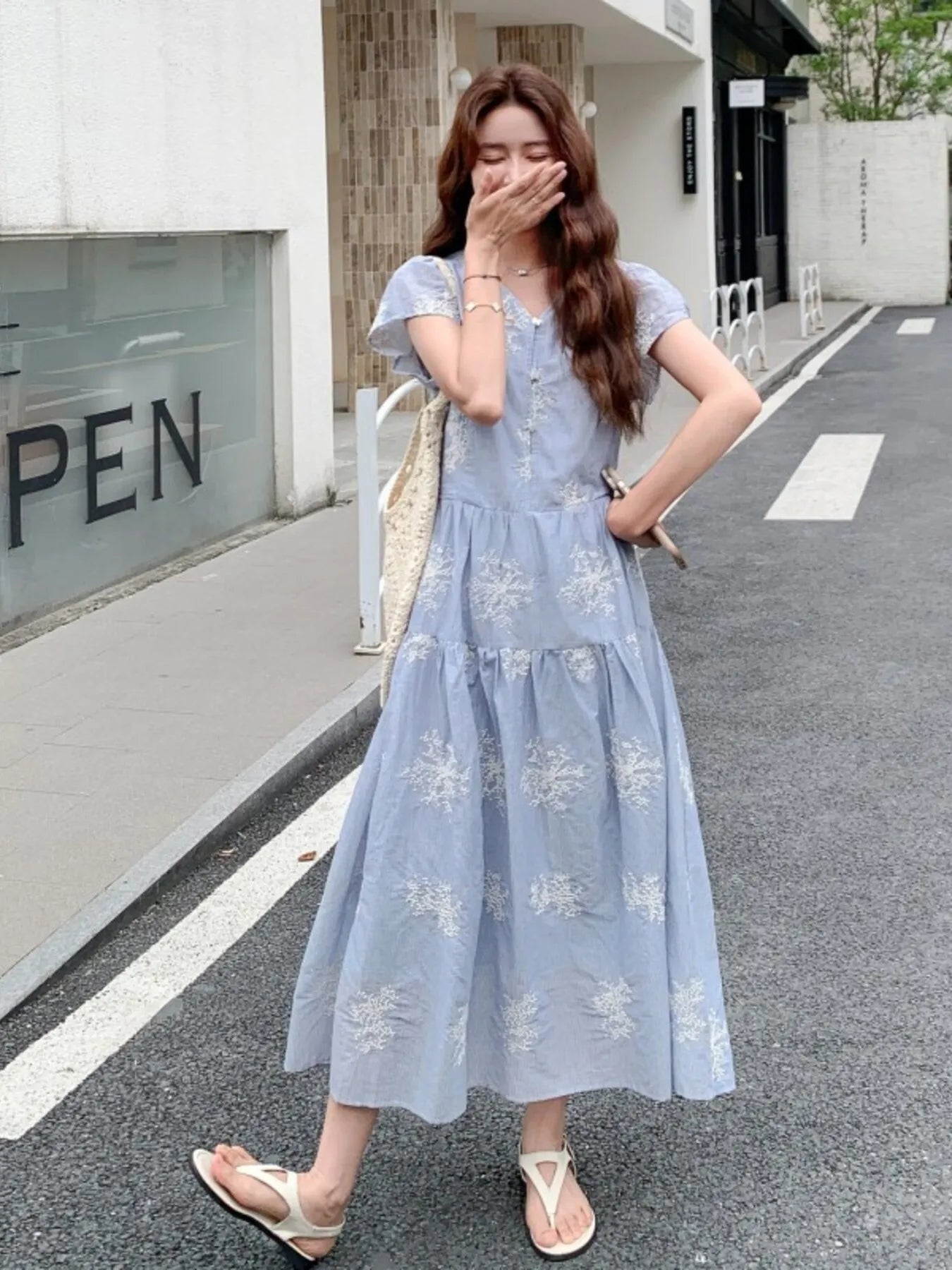 Vestido Midi Azul con Mangas Cortas y Diseño de Capas
