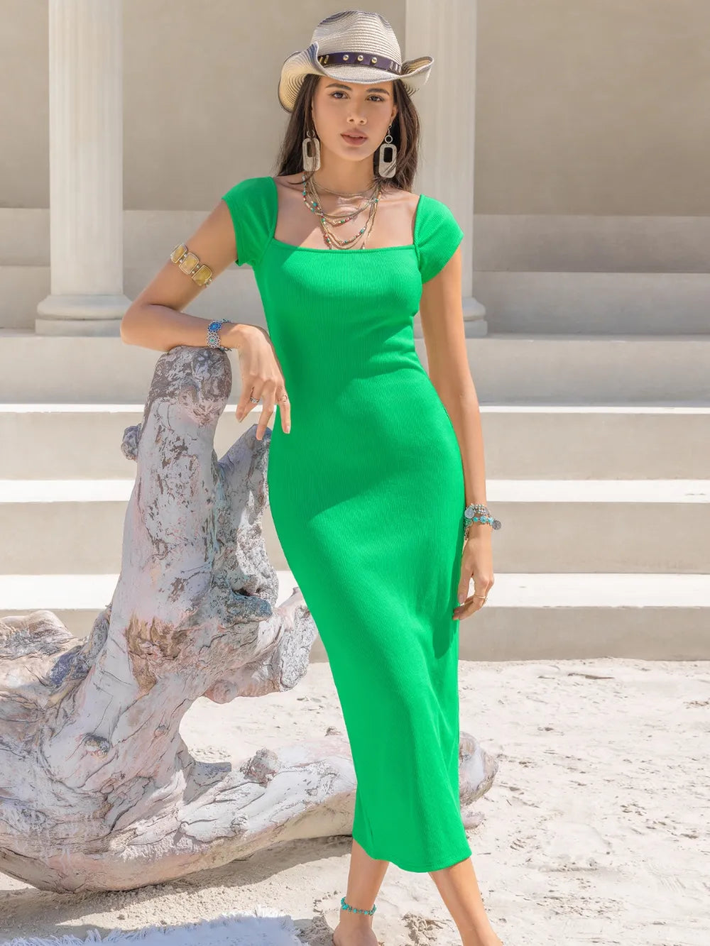 Vestido Midi Verde con Mangas Cortas y Cuello Cuadrado